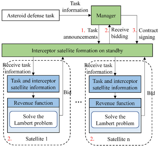 According to the revenue function of each interceptor satellite, the manager selects the winning interceptor satellite with the largest revenue function and updates the task allocation list. The whole process is cycled until all the tasks are assigned.