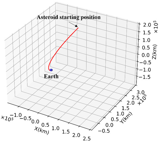 The initial position of the asteroid with an impact threat is located at the boundary of the Earth’s gravitational capture range, and its position and velocity vector were set as in Table 2. The initial flight trajectory of the asteroid is shown in Figure 5.