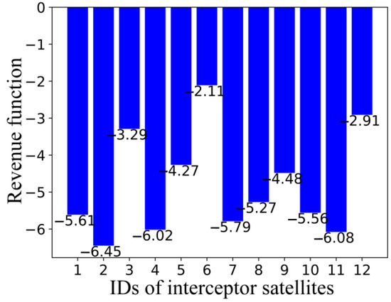 When , according to the analysis in Section 5.2.1, the required impulse velocity increment applied to asteroid is 0.375 km/s. Therefore, referring to the graph of - , the defence task requires four interceptor satellites in coordination. The revenue function in the contract net protocol algorithm is shown in Figure 7. According to the revenue function diagram, no satellite has positive revenue functions; that is, no interceptor satellite can rendezvous with the asteroid. The planned interception time is too short, and although the impulse velocity increment required for the asteroid is small, the impulse velocity increment required for the interceptor satellite rendezvous is too large to rendezvous with the asteroid. Therefore, the asteroid interception fails when .