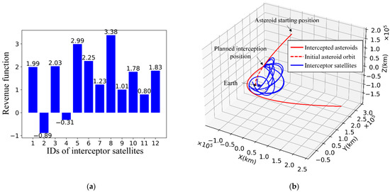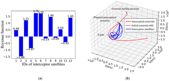 When , according to the analysis in Section 5.2.1, the required impulse velocity increment applied to asteroid is 0.925 km/s. Therefore, referring to the graph of - , the defence task requires 10 interceptor satellites in coordination. The revenue function in the contract net protocol algorithm is shown in Figure 9a, and the total trajectory diagram of the asteroid and the intercepted satellites is shown in Figure 9b. The interceptor satellites assigned to the defence task were No. 1, No. 3, No. 5, No. 6, No. 7, No. 8, No. 9, No. 10, No. 11, and No. 12 satellites. When , the number of interceptor satellites required is higher, and the impulse velocity increment required for interceptor satellite rendezvous is less than .