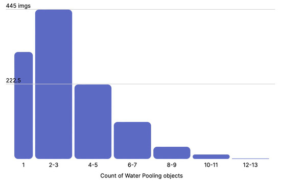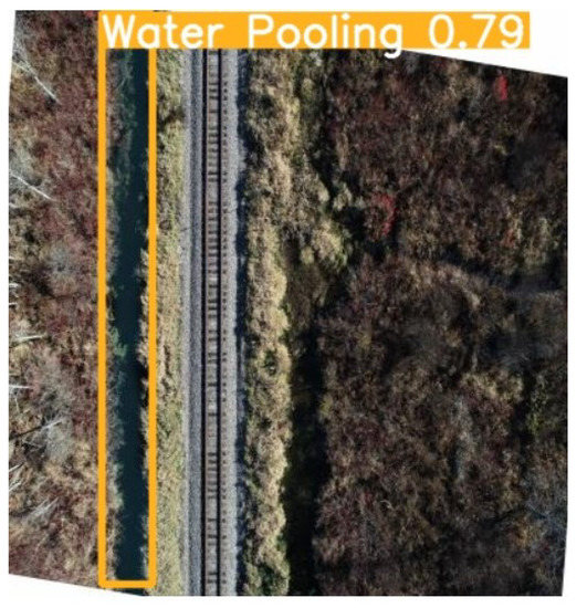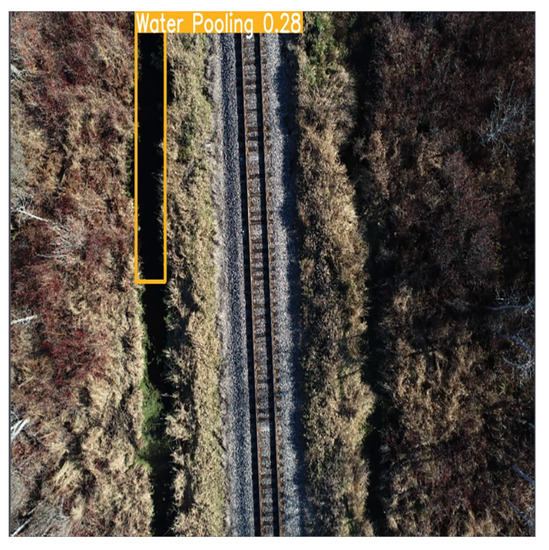 - Water Pooling: Any water body captured in the images was annotated as water pooling to identify the sites affected by water pooling near the tracks. An example is shown in Figure 9.