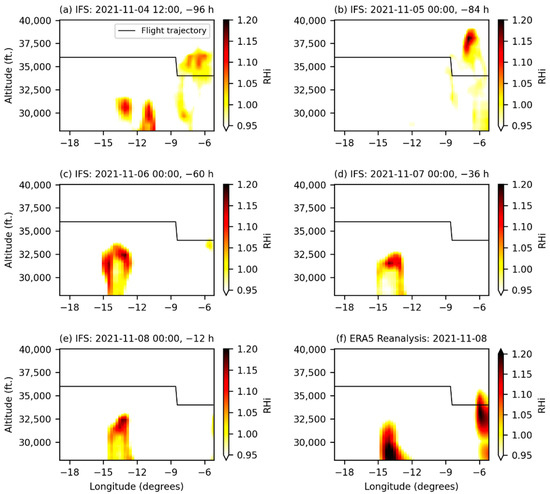 Evolution of ISSR forecasts provided by the European Centre for Medium-range Weather Forecast (ECMWF) Integrated Forecast System between T-96 h (panel a) and T-12 h (panel e), and the actual ISSR encountered during a flight (panel f) provided by the European Centre for Medium-range Weather Forecast (ECMWF) ERA5 High-Resolution Realization Reanalysis.