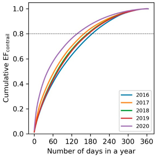 Cumulative density function of the annual EFcontrail versus the number of days in a year that accounts for the proportion of EFcontrail over the North Atlantic (Shanwick and Gander FIRs) between 2016 and 2020 (Derived using data provided by Teoh et al. [21]).