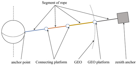 According to the design in literature [10], the design of the segmented space elevator system model is to subdivide the rope into several segments along the length direction. Each segment of rope can be composed of several equal cross-section tethers in different numbers and connected by a connecting platform. The model is shown in Figure 1.