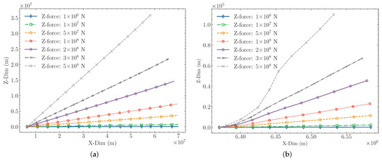 Calculation results of lateral loading at zenith anchor. (a) Deformation of the rope by lateral force loading. (b) Deformation of the rope near the anchor point on the ground by lateral force loading.