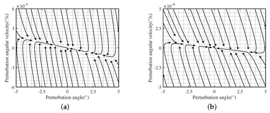 When and , Equation (19) has four different negative real roots. It can be seen from Figure 6 that the nearby state vector fields all point to this equilibrium point and are finally stabilized at this equilibrium point. Therefore, the equilibrium point is a stable node, and the original nonlinear system is asymptotically stable near the equilibrium point .