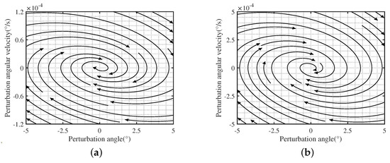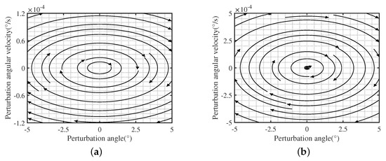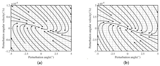 When , or , , Equation (19) has a pair of negative real roots and a pair of conjugated imaginary roots with negative real parts. When the roots are negative real, the phase diagram are similar with Figure 6; when the roots are conjugated imaginary, the phase diagram are similar with Figure 7. The nearby state vector fields all point to this equilibrium point and eventually stabilize at this equilibrium point. Therefore, the linear system is strictly stable at , and the original nonlinear system is asymptotically stable near the equilibrium point .