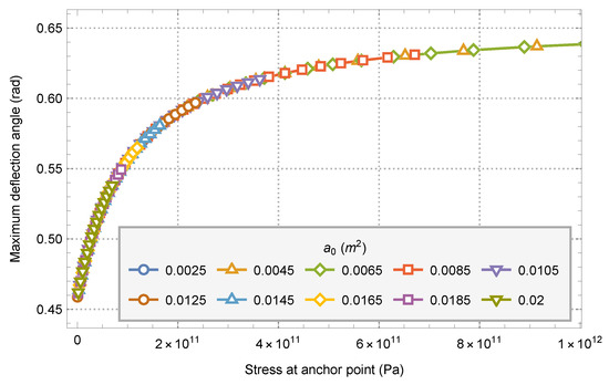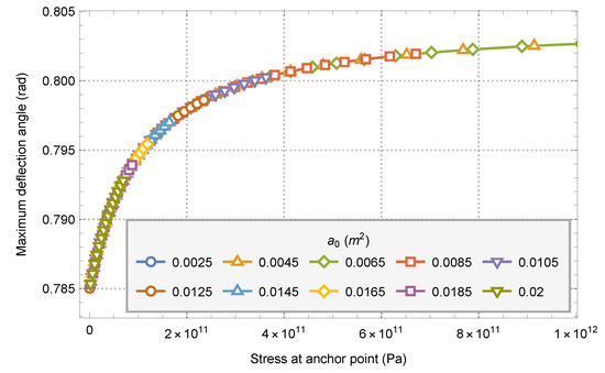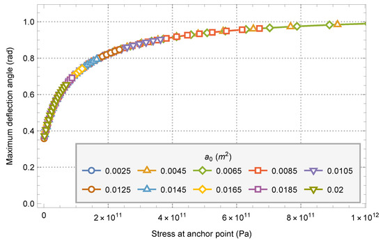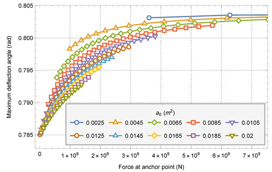 Considering the mass of the zenith anchor and the cross-sectional area of the anchor point, the tension of the anchor point is used as a parameter to analyze the maximum deflection angle outside the equatorial plane of the system. The zenith anchor mass is in the range of 3.50 × 109 to 10.00 × 109 and the cross-sectional area of the anchor point is in the range of 0.001 m2 to 0.02 m2. The anchor point tension of each model is calculated by using the method in [21], and the relationship between the anchor point tension and the system maximum deflection angle is obtained, as shown in Figure 11.