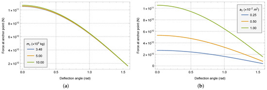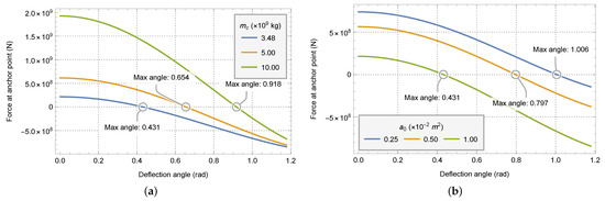 The graph of tensile force at the anchor point with offset angle under the condition of different parameters. (a) With different zenith anchor masses . (b) With different initial cross-sectional areas .