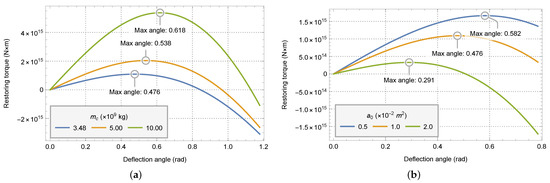 The graph of restoring torque with offset angle under the condition of different parameters. (a) With different zenith anchor masses . (b) With different initial cross-sectional areas .