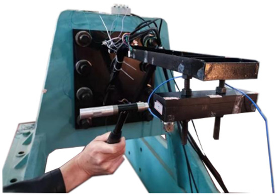 During the test process, the impact load test was carried out under the two working conditions of a single pylon and a double pylon, respectively. Use the data collector to connect the hammer data to the first channel. According to the position and number of the strain gauges on the pylon, the response signals of the strain gauges are connected to the second, third, fourth, and fifth channels, respectively. Set the sampling frequency to 4096 Hz, that is, the sampling interval is 0.00025 s, and the total time of each sampling is 100 s. In order to ensure that the response of the previous tapping will not affect the next response signal, tap once every 13 s. Use the force hammer to excite at the center of the weapon’s tail, as shown in Figure 4, for the experiment of the single pylon.