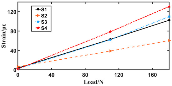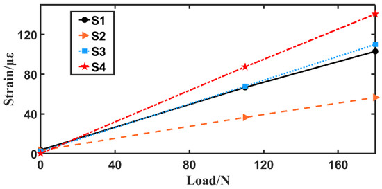 The stable steps in the strain gauge data are averaged to obtain the strain value under the corresponding static load, and the relationship between the strain and the static load is drawn, as shown in Figure 6 and Figure 7.