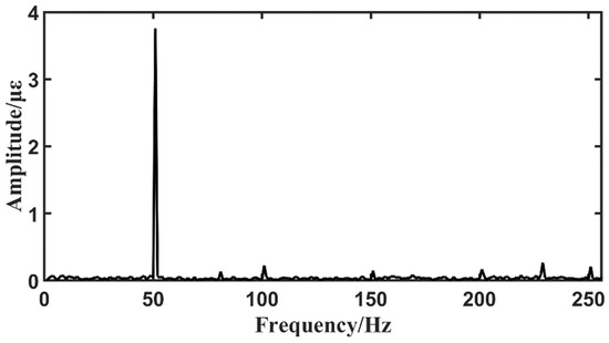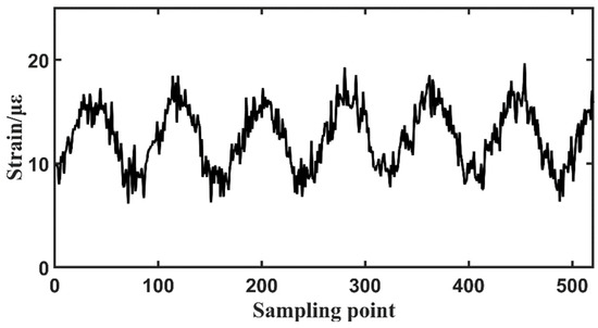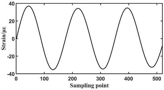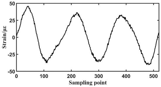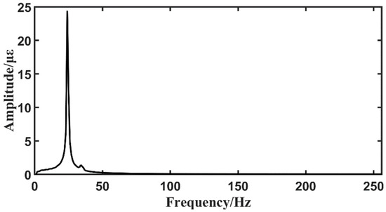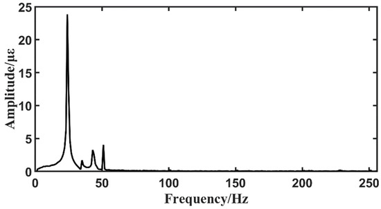Part of the response signal is intercepted. It can be seen from Figure 10 that the collected strain response is approximately a sinusoidal signal, which is the result of the superposition of signals of different frequencies, which conforms to the assumption that the structure is a linear system. The frequency domain characteristics of the response are shown in Figure 11. The strain response is dominated by low-frequency components, and more than 80% of the energy is concentrated in the first two-order eigenfrequencies. Design a low-pass filter according to the sampling frequency and the characteristics of the noise to reduce the noise and preserve the main properties of the structural strain response.