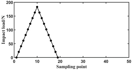 The impact load, shown in Figure 14, is much smaller in width (about 15 samples) than the lower-order modal response (about 200 samples). In line with the assumption of standardized treatment, the specified standardized load action width is 17 sampling points, and the impact load is standardized to obtain the standard load in a symmetrical triangle type, as shown in Figure 15: