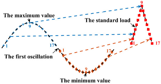 Take the position information of the strain gauge as the first group of input. Intercept the first nine oscillations of the filtered response signal, mark the extreme value of each oscillation and obtain eight marked points at equal distances before and after the extreme value, and number the marked points corresponding to each extreme value in turn. Establish the mapping relationship between the signal marker and the standard load, as shown in Figure 16. Through intercepting multiple oscillations of the signal and selecting multiple markers per oscillation, the time-domain information of the response signal can be more fully utilized.