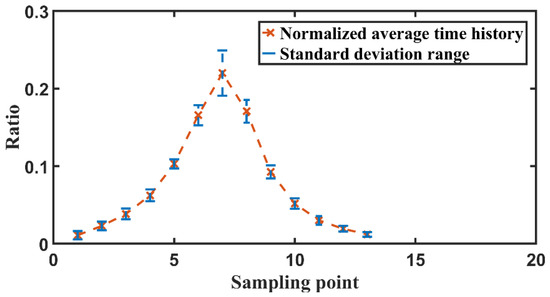 For a specific weapon, although the time history of the impact load generated by each launch is different, the overall trend of the change is basically the same. Therefore, the average load variation history and the standard deviation of each sampling point can be obtained by performing statistical processing on multiple launches. For the test in this paper, the tapping process is completed by the same person, which can be regarded as a “specific weapon launch”. The normalized average time history by statistical processing is shown in Figure 18.