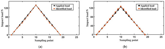 It can be seen that the maximum relative error of load identification under the two working conditions is less than 10%, which can meet the requirements of the project. In the case of a single pylon, a response that does not participate in training and verification is selected for testing. As shown in Figure 19a, the load identified by the neural network is compared with the standardized impact load, and the identified load is a little small. The maximum identification error is 8.87% and the average error is 4.29%, which meets the requirements. As shown in Figure 19b, the maximum identification error of the double pylon is 4.70% and the average error is 2.46%. The overall identified load is larger than the applied impact load.