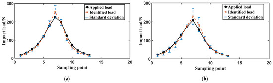 According to the principle of the equivalent area and the normalized average time history obtained by statistics, the standard load is converted back to the original form, as shown in Figure 20. Compared with the load applied in the test, it can be seen that the deviation between the identified load and the applied load near the peak value under the two working conditions is basically within the standard deviation range. Although the identification deviation of some sampling points at the end exceeds the standard deviation range, the degree of excess is very small. It has high recognition accuracy, and the average error around peak value is less than 10%. By increasing the number of tests, the average change history obtained by statistics will better reflect the change characteristics of the “specific weapon” impact load, and further reduce the identification error.