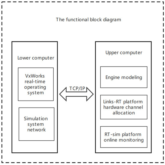 Figure 1 shows the functional block diagram of the simulation process of an LRE. The real-time simulation platform uses MATLAB/Simulink for modeling and the VxWorks operating system for the closed-loop simulation iteration process. This process first employs modular modeling and simulation, relying on MATLAB/Simulink to establish the model’s components under different states, such as the liquid rocket engine combustion chamber, fuel preloading turbine model, gas turbine model, pump model, and thermal component model. The components are connected according to the correlation between the engine components, and an off-line simulation ensures the model’s feasibility and accuracy. Then, according to the links and RT hardware driver module requirements of the general real-time simulation platform, I/O hardware interfaces such as the channel initialization module and the lower computer synchronization module are split and added to meet the hardware/software real-time communication requirements in the loop simulation platform. Through the main control software, RT-sim, we set the attribute parameters of the real-time computer simulator, deploy the corresponding target machine, and select and save the variable parameters that need to be monitored, recorded, and edited. Finally, the real-time simulation system realizes the online monitoring and modification of the variable parameters through the monitoring panel to convert the working conditions and fault injection. The RT hardware and I/O hardware used here comes from the company Linkstech, Changping District, Beijing, China.