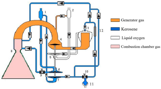 Diagram of the LRE structure. (1. Fuel pre-pressure turbine pump; 2. oxidant pre-pressure turbine pump; 3. gas generator; 4. main turbine; 5. oxidant pump; 6. fuel primary pump; 7. fuel secondary pump; 8. combustion chamber; 9. throttle valve; 10. flow regulator; 11. starting box; 12. ignition duct).