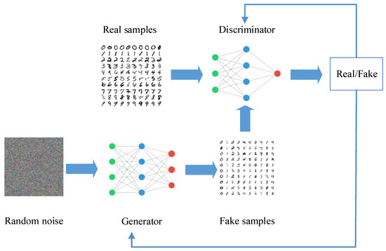 GAN is a framework for estimating the generation model through a confrontation process [32]. It can learn the distribution of actual samples without a priori probability modeling. GAN comprises a generator and a discriminator model relying on neural networks. The generator maps the input noise signals to the sample space through the neural networks and outputs the fake data to be as true as possible. The discriminator judges whether the sample originates from the generator’s fake samples or the real samples in the real data distribution. During GAN training, both models are optimized alternately to achieve Nash equilibrium. Finally, the samples generated by the generator conform to the real sample probability distribution. After completing the training process, the generator estimates the original data’s probability distribution well. Figure 4 illustrates the classic GAN training process.