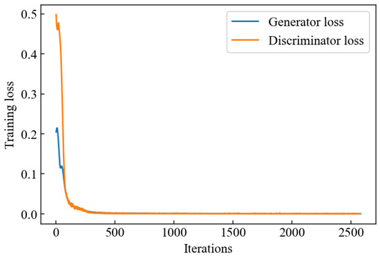 The deep learning environment of this research was based on Python 3.8.12 and PyTorch 1.10.0. The operating environment was Microsoft Windows 11, and processing was performed on an NVIDIA GeForce GTX 1650 with 4 GB VRAM. All experiments were completed on the jupyter notebook. Considering the LSTM-GAN with a sample size of 10 × 24 as an example, the training data were input into the LSTM-GAN-10 for training, where the training process is illustrated in Figure 6. After about 2600 iterations, the losses of the generator and the discriminator stabilized and were close to zero, reaching an ideal state.