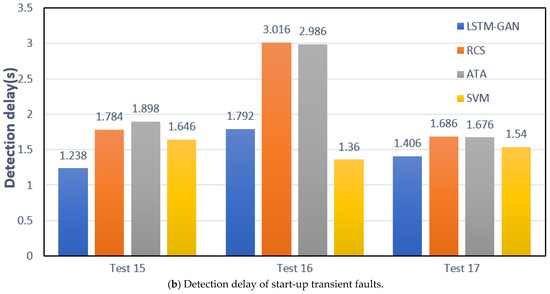 In most cases, the LSTM-GAN having a sample size of 10 × 24 performs well. Thus, we compared it with RCS, ATA, and SVM, as shown in Figure 7. It can be seen that the detection delay of LSTM-GAN on other test sets is significantly lower than that of RCS, ATA, and SVM, except that the detection delay of test 16 is higher than that of SVM. Therefore, compared with RCS, ATA, and SVM, LSTM-GAN performs better in terms of timeliness.