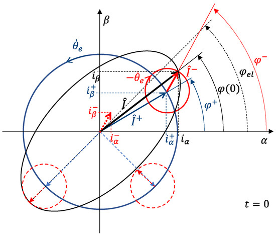 When an ITSC fault occurs, the central point of the Y-connection is isolated, so the zero-sequence current is zero, and the ellipse tracked by the current phasor () can be considered as the sum of two counter-rotating phasors: positive- () and negative-sequence phasors (), as given by: