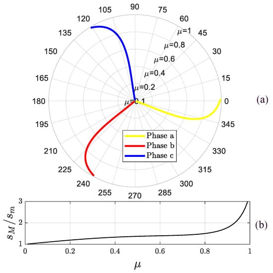 The solution of Equation (20) in terms of current phasors are presented by the polar-coordinate plot in Figure 6a, in which, given along the radius the ITSC fault extension (), the inclination of the ellipse major axis of the current phasor trajectory is reported along the phase angle for each motor phase. In addition, Figure 6b shows the ratio of ellipse semi-axes lengths as a function of the ITSC fault extension parameter . It is worth noting that, if an ITSC fault occurs on phase a (b, c), the ellipse inclination will be 0° (240°, 120°) ±15°.