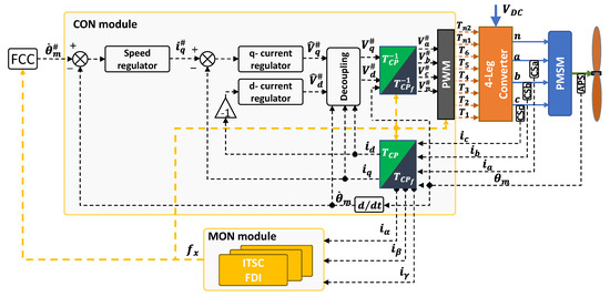 The CON module operates the closed-loop control of the system by implementing two nested loops on propeller speed and motor currents (via Field-Oriented Control, FOC). All the regulators implement proportional/integral actions on the tracking error signals, plus anti-windup functions with back-calculation algorithms to compensate for commands saturation. The MON module executes the health-monitoring algorithms, including the FTC proposed in this work.
