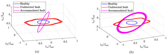 Concerning the current-based methods, the most relevant one is based on the so-called Park Vector Approach (PVA) [28,29,30,31]. When the PMSM is operating in normal conditions, the current phasor in the Clarke plane draws a circular trajectory, while it follows an elliptic one if a stator fault occurs. In PVAs, the fault index is thus defined by a geometrical distortion factor, obtained by currents measurements. Though demonstrating to be excellent for online ITSC FDI, the PVA is not able to locate the shorted phase.