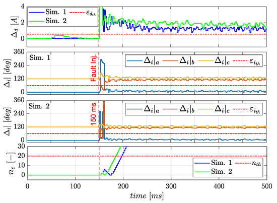The most common strategy is given by the voltage-based methods. Immovilli and Bianchini [22] propose reconstructing harmonic patterns of the voltage components in the Clarke plane. The technique works very well in transient conditions, but it is not able to identify the shorted phase. The FDI algorithm proposed in [23], implements an estimator of back electromotive force and detects the ITSC by comparing the estimates to a reference model. The method is very robust against load disturbances, but it requires a very accurate model of the Back Electromotive Force (BEMF). Other approaches use as fault symptoms the harmonic components of the Zero Sequence Voltage Component (ZSVC) signal. Urresty et al. [24] proposes a Vold–Kalman Filtering Order Tracking (VKF-OT) algorithm to track the ZSVCs first harmonic component. The method offers reliable indicators, which are applicable in transient phases too, but it needs to be extended in terms of fault isolation. A robust algorithm is proposed by Hang et al., in [25], where the fault indicators are defined to remove the influence of rotor speed variation and a frequency tracking algorithm based on reference frame transformation is used to extract the fault symptoms. A possible drawback is the dependency of the fault indicator on the PMSM parameters, which may vary with environmental temperature. Boileau [26] considered as a fault indicator the amplitude of the positive voltage sequence while Meinguet [27] used as an indicator the ratio between the amplitudes of negative and positive voltage sequences. These methods are not able to locate the shorted phase, neither.