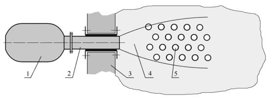 More promising and versatile is the method of pneumopulse cleaning. In this case, a pulsed air jet is formed using a pneumopulse generator []. A typical installation diagram of a pneumopulse generator for cleaning a tubular heat exchanger is shown in Figure 1. Compressed air with a pressure of 0.8–1.0 MPa is preliminarily accumulated in the accumulative cavity of the pneumogenerator with a volume of 0.02–0.05 m3. At a given moment in time, a quick-acting shutter opens and compressed air is ejected through an exhaust pipe with a diameter of 100–150 mm, affecting the heat exchange surfaces being cleaned.