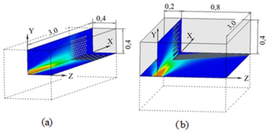 In the case of a jet impingement at an angle of α = 45°, the left part of the flow pattern (Z = −0.2 m) was also partially calculated, in which one could expect the force effect of the oncoming jet. The size of the computational domain in this case was X × Y × Z = 3.0 m × 0.4 m × 1.0 m.