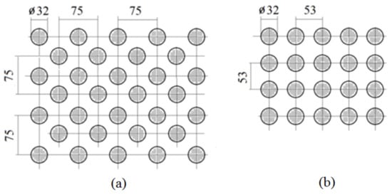 Configuration of the tubes in the package. (a)—chess arrangement; (b)—corridor arrangement. Dimensions in mm.