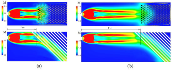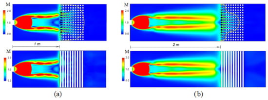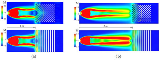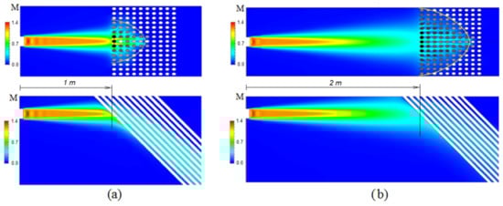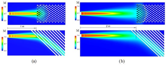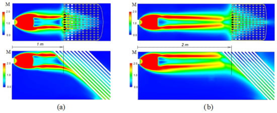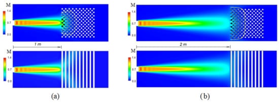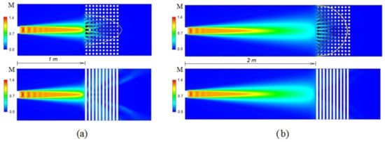 Blowing of the tube package with an air jet with a pressure of P0 = 2.35 MPa. (a) Case 9; and (b) case 13. Upper—XOY plane, lower—XOZ plane.