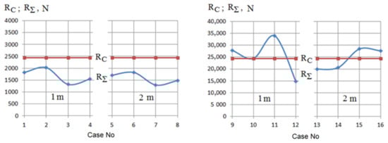It can be seen from Table 1 and Figure 12 that at a total pressure at the nozzle exit P0 = 0.235 MPa (Cases 1–8), the total force RΣ acting on the tubes in package ranges from 1316 N to 2024 N (54% to 84% from the total jet force RC). The number of effectively blown tubes in a package at the distance 1 m constitutes 29% at chess arrangement (case 1) and 47% at corridor arrangement (case 2). Inclination of the jet flow 45° gives us 38% at chess arrangement (case 3) and 25% at corridor arrangement (case 4) because chess arrangement is turning into corridor arrangement and vice versa. At the distance of 2 m, the number of effectively blown tubes in a package constitutes 42% at chess arrangement (case 5) and 72% at corridor arrangement (case 6). This is explained by increasing of affected area. Inclination of the jet flow 45° at this distance gives us a decrease of affected tubes to 31% at chess arrangement (case 7) and 57% at corridor arrangement (case 8).