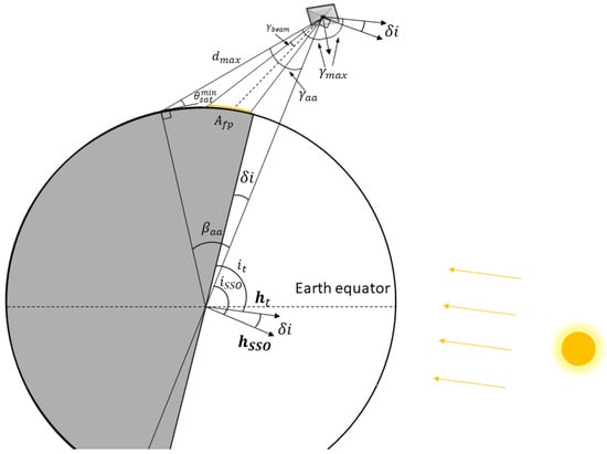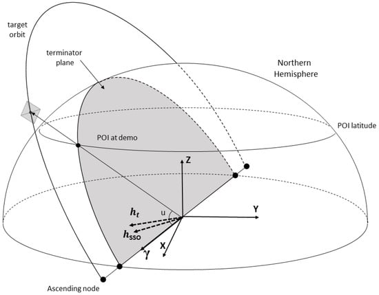where is the unit vector (in ) of the Sun direction as seen from Earth, is a latitude of the target region. The orbit design geometry is illustrated by Figure 2, which shows the case for negative Sun declination and POIs location in the Northern Hemisphere.