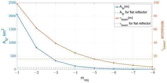For the critical parameters, let us find the curve of the reflected half beam angle as function of the required pixel magnitude for a 32 square meter reflector. Figure 4 shows the dependence of the half beam angle on the required pixel magnitude ranging from −1 to −8 (blue line). The red line on the figure shows the corresponding footprint area. The horizontal lines represent the case of a flat reflector when its half beam angle is equal to the half angular size of the Sun known to be about .