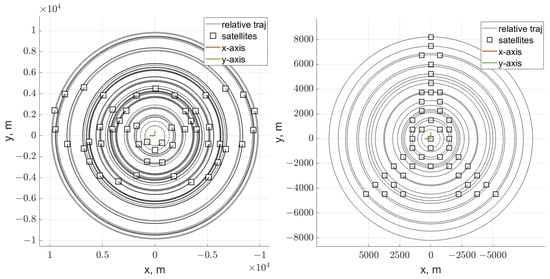 where . All other perturbations are not considered. The orbital motion dynamics equations would normally include the influence of the atmospheric drag, which can significantly impact the orbit of satellites in lower orbits. However, as the target orbit is chosen to have the altitude of about 900 km (see Section 3), the drag force can be neglected.
