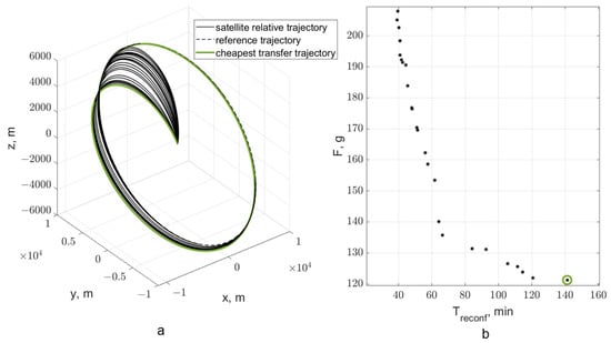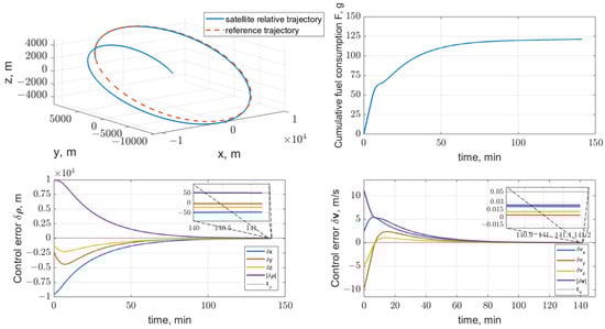 Figure 7 demonstrates the control algorithm performance for the chosen gain matrix . Top left graph represents the relative satellite trajectory during deployment, top right shows cumulative fuel consumption, and bottom graphs depict the control errors and during deployment. It takes 141 min and 121.3 g for reaching the reference trajectory.