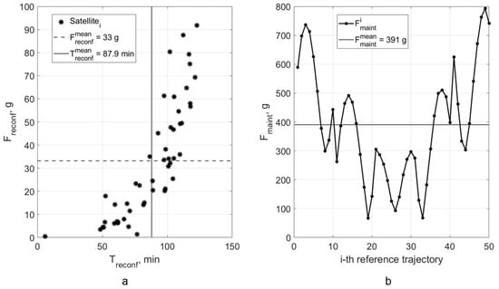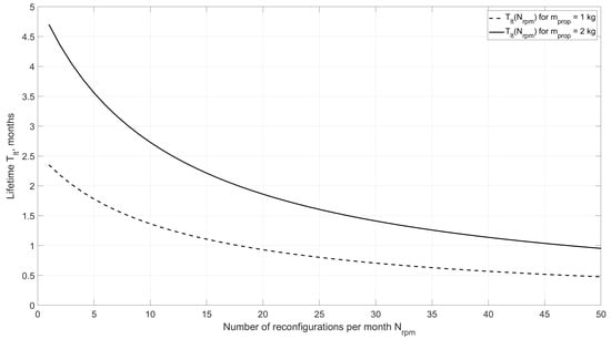 Let us estimate the mission lifetime for the chosen target orbit and the orbital configurations presented in Figure 5. The estimate can be derived from the mean fuel consumption for reconfiguration between orbital configurations and mean monthly fuel consumption for reference orbits maintenance. We shall assume that the reconfiguration is what takes place after the cluster launch when the formation needs to be deployed into an image or whenever there is a need to change the orbital configuration and start displaying a new image. At all other times, the formation spacecraft operates in the maintenance regime.