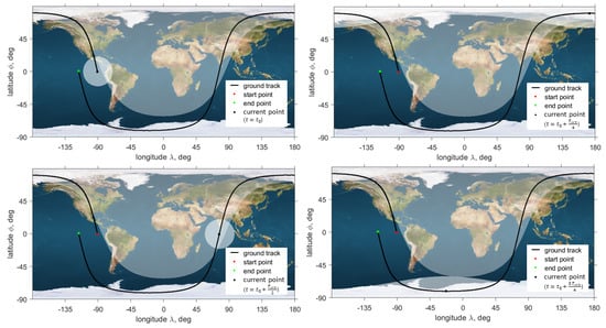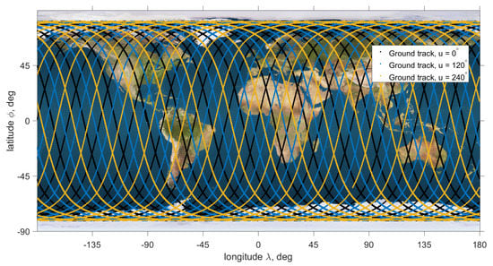 The demonstration revenue depends on the target orbit’s ground track that can be adjusted by the argument of latitude of the target orbit u for the fixed orbit epoch. The ground track is a set of elevation angle and azimuth angle of the orbital reference frame origin position vector given in the noninertial frame . Figure 19 illustrates the change of the orbit ground track depending on the argument of latitude u with the initial conditions presented in Table 3.