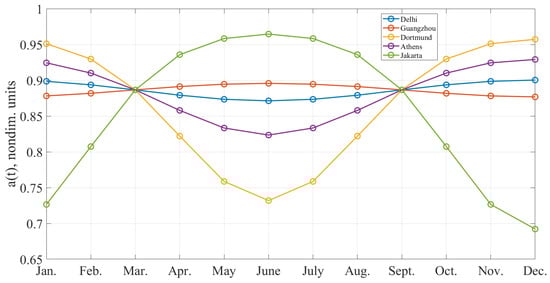 We shall consider the orbits that repeat daily to make image demonstrations over the most densely populated Earth regions as often as possible. The orbit altitudes range from 500 to 1000 km, because our prior research has shown that at lower orbits, the mission lifetime suffers from the excessive fuel expenditure to counteract the effects of the atmospheric drag, whereas the upper bound comes from the condition of having bright enough pixels while keeping the reflectors’ size to that which has been successfully operated in space missions. Given the altitude range, there remain two possible orbits to be used—the one that performs 15 revolutions per day and has 568.13 km altitude and another that performs 14 revolutions per days and has an altitude of 895.45 km. The latter is chosen to be the target orbit in the subsequent analysis, because it corresponds to the larger access area yielding greater mission revenue. The inclination of the 895.45 km altitude circular SSO is degrees.