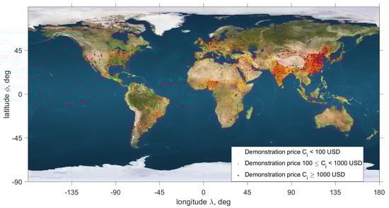 Let us note that the demonstration prices introduced in Section 6.2 correspond to the case when the whole territory of a city is covered. Therefore, taking into account that a satellite typically has a smaller footprint area , let us redefine the demonstration price for a specific demonstration mission as follows:
