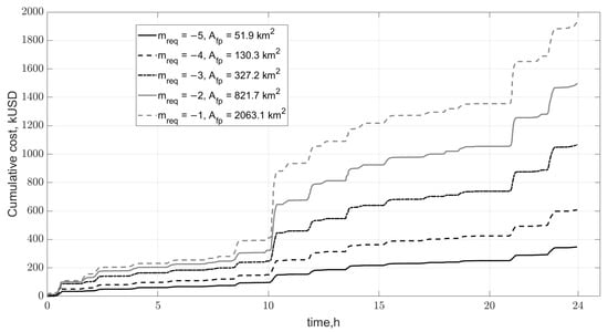 Let us find the dependence of the daily mission revenue on different footprint areas . For this purpose, the mission revenue is optimized according to (31) for the footprint area from Table 1. Figure 21 demonstrates cumulative price curves for demonstrations performed with reflectors of different half beam angles defined in Table 1. Table 4 represents the optimization results.