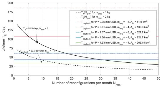 It can be seen that the formation with satellites equipped with flat reflectors is not economically feasible because it requires the lifetime of about a half of a year which is not reachable for the considered orbital configurations and spacecraft parameters. A greater satellite footprint area allows increasing mission’s daily revenue and hence decreasing payback period, thus making the mission economically feasible. However, the greater the footprint area, the dimmer is the demonstrated image. For example, a mission demonstrating images with magnitude of individual pixels has the payback period of 33.7 days, while a formation operating for 91.5 days (for = 2 kg) can perform 24 image demonstrations within the lifetime, meaning 24 potential contractors for the mission with a net income of about 111.6 million USD.