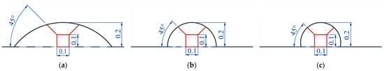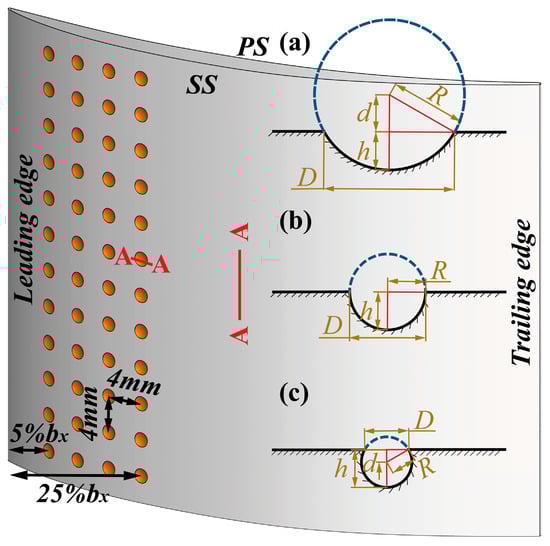 Figure 2 shows the schematic of the dimples. Four rows of spherical dimples were arranged in parallel on the suction surface (SS) of the blade at a position of 5–25% of the axial chord (). The depth of the dimple was 0.2 mm, which was considered to achieve a better performance in Ref. []. The spacing between dimples in the streamwise and spanwise directions was 4 mm, which is an empirical value and will be discussed further in the future. The ratio of dimple depth-to-print diameter (, is the dimple depth, is the dimple print diameter) between 0.125 and 0.875, which was adjusted by changing the print diameter while keeping the depth unchanged, was studied. The geometric relation can be obtained from Figure 2a, which explains that a dimple can be determined only with the parameters of the ratio and the depth . The portion of the dimple with that invades the blade is an inferior arc (INF). When the ratio meets , the depth equals the radius of the sphere, and the part of the dimple immersed in the blade is a semicircular arc (SEM). When , becomes negative, which means that the immersion is a superior arc (SUP). In order to cover all shapes, the schemes of the dimple and the corresponding specific parameters are shown in Table 2.