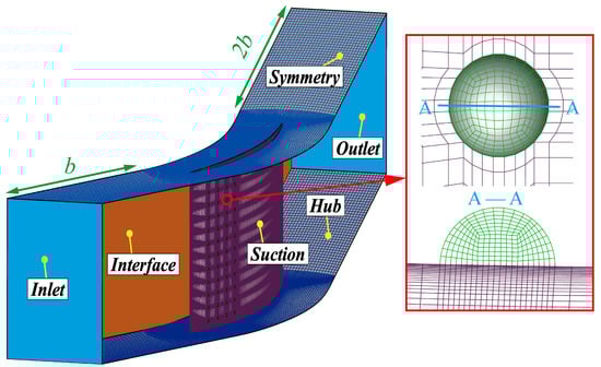 In order to save computing resources, the computational domain was constructed based on a single blade passage with half-span. The inlet was located at 1.0b upstream of the leading edge and 2.0b downstream of the trailing edge for the outlet. Hexahedral structural meshes were generated with an H-O-H topology in Ansys ICEM, shown in Figure 3. For mesh details inside the dimple, a C-shaped topology, which is conducive to maintaining the orthogonality at dimple junctions, was used, as shown in Figure 4. Therefore, the angle of the generated mesh is more than and the mesh warpage is less than . The first mesh layer height () was estimated at m to ensure a value of approximately 1, which ensures that the turbulence model used in this simulation could accurately capture the transition boundary layer. Meanwhile, the growth rate of the grids was set to 1.1 to prevent divergence.