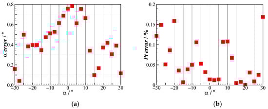 The measurement error should consider the precision of transducers, the accuracy of the displacement mechanism and the measurement errors of the five-hole probe. The precision of the pressure transducer was 0.05%, and the error of angle rotation was . After experimental measurement, the error of the angle and total pressure of the five-hole probe were determined as and 0.2%, respectively (Figure 6). Thus, the error of the measured angle () was , and the accuracy of the measured total pressure () was approximately 0.21%. Furthermore, the error of the total pressure loss coefficient () was about , calculated according to the following equation: